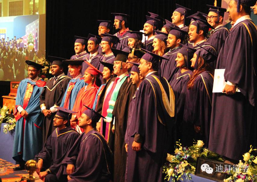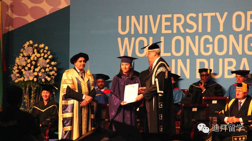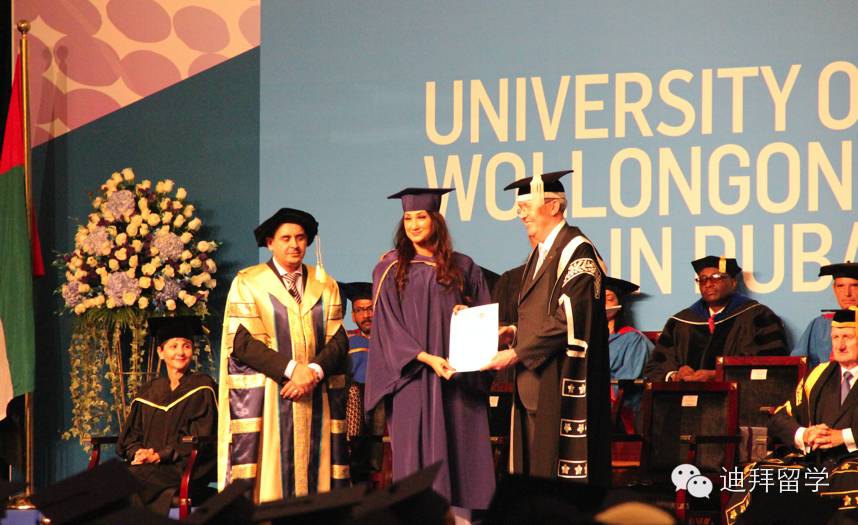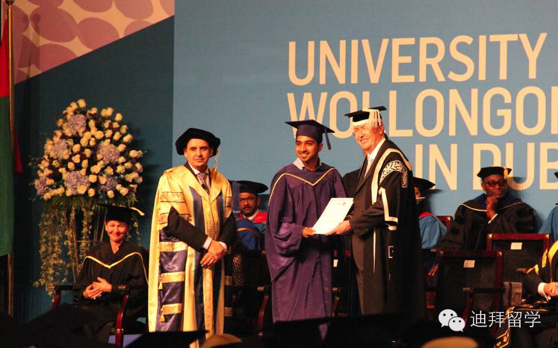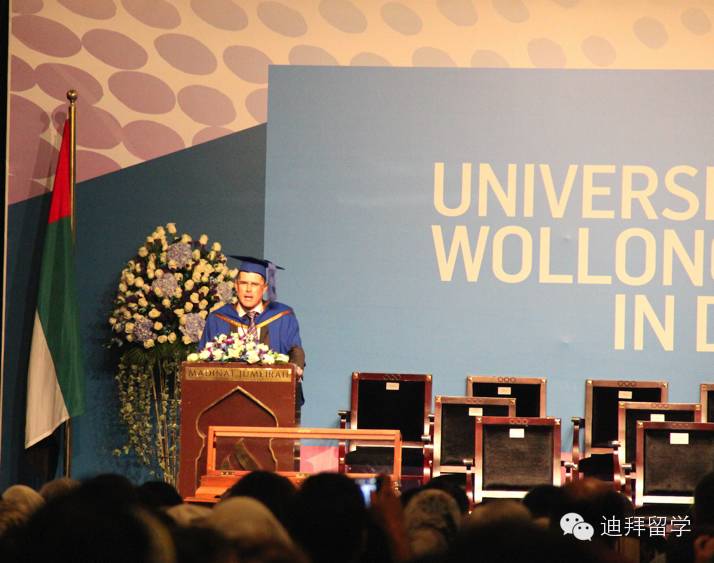 迪拜卧龙岗大学校长Professor Salem致辞,并和澳大利亚卧龙岗大学副校长一起为每一位毕业生们加冕授予学位证书