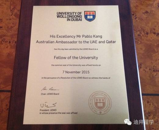 迪拜卧龙岗大学第28届毕业生典礼在Madinat Jumeirah隆重举行,据悉本次典礼分下午和晚上两部分,下午为本科生,晚上为研究生的毕业学位授予。莅临本次典礼的嘉宾有嘉宾迪拜皇室HH Sheikh Hasher bin Maktoum al Maktoum,澳大利亚驻阿联酋&卡塔尔大使Pablo Kang,澳大利亚卧龙岗大学副校长Paul Wellings等, 典礼上Pablo Kang大使被授予为迪拜卧龙岗大学学者,1⃣️感谢大使长期以来对迪拜卧龙岗大学的支持与关注。