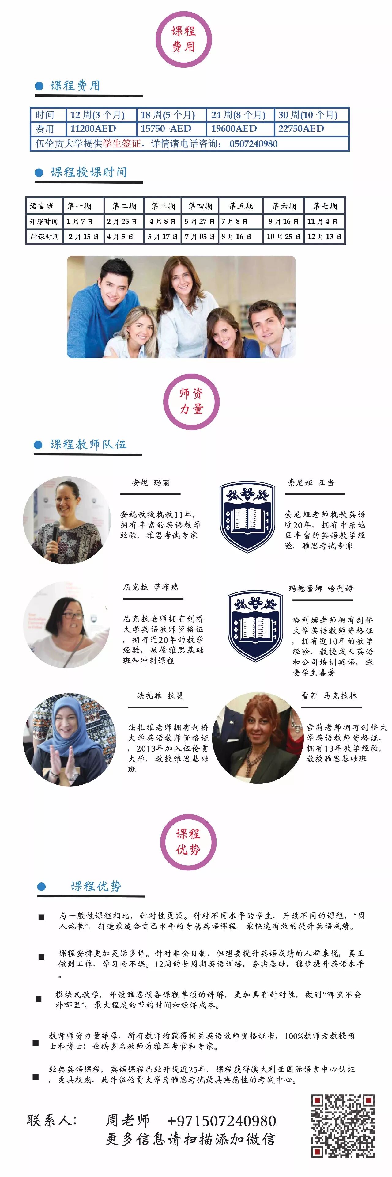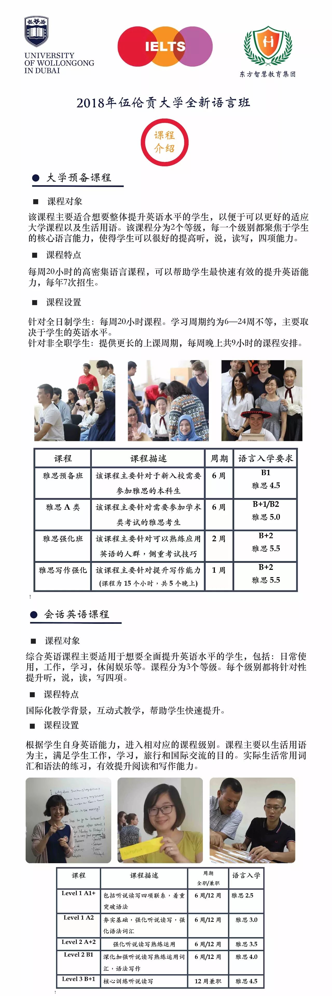 澳洲伍伦贡大学迪拜分校的语言中心 (LSC) 是迪拜最大的雅思考试中心,每月都会举行两到三次的雅思考试。语言中心的老师都是母语为英语的老师,并具有丰富的教学经验。因此,语言中心不仅会帮你提高雅思考试所需的听说读写技能并会为你进一步在大学的本科或研究生学习做准备,多名任课老师也是雅思考试的考官。语言中心一年会提供7次入读语言课程的机会,为学生提供了选择上课日期和时间的灵活性。由于课程强度大,每周学校都会安排考试,每学期结束也会进行雅思模拟考试,以检测学生是否达标。 2018年新学年的英语班将于1月7号开课, 每一期顺利毕业的学生都会有伍伦贡大学颁发的结业证书。想提高英语就来报名吧!