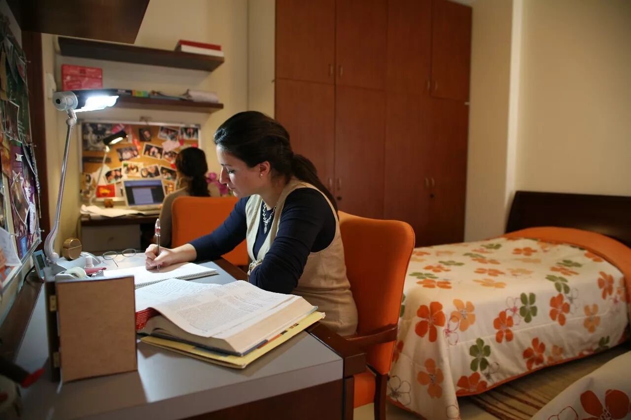 住宿:学生宿舍在离学校15分钟车程的JebelAli 花园区,每天有不间断的校车来往于学校及宿舍之间。语言学生一学期5500迪拉姆,第一次入住需要交两学期住宿费另外还需交1000迪拉姆押金,共12000迪拉姆(包含1000迪拉姆押金),两人一间。宿舍设施一应俱全,可以做饭,定期有专人打扫。WiFi和卫星电视均为免费。学生也可以选择不入住学校宿舍,学校每5分钟提供来往于地铁站和校园的免费班车。如学生选择校外住宿,平均费用为每月1500到2500迪拉姆,但没有校车服务。
