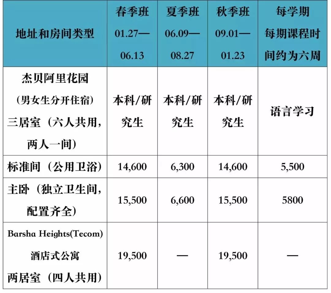 学生宿舍在离学校15分钟车程的Jebel Ali 花园区,每天有不间断的校车来往于学校及宿舍之间。本科研究生学生一学期为4个月,费用共15,600迪拉姆(包含1000迪拉姆押金),两人一间。宿舍设施一应俱全,可以做饭,定期有专人打扫。WiFi和卫星电视均为免费。学生也可以选择不入住学校宿舍,学校每5分钟提供来往于地铁站和校园的免费班车。