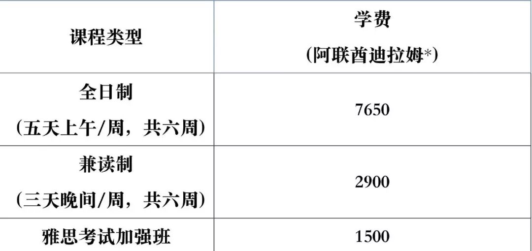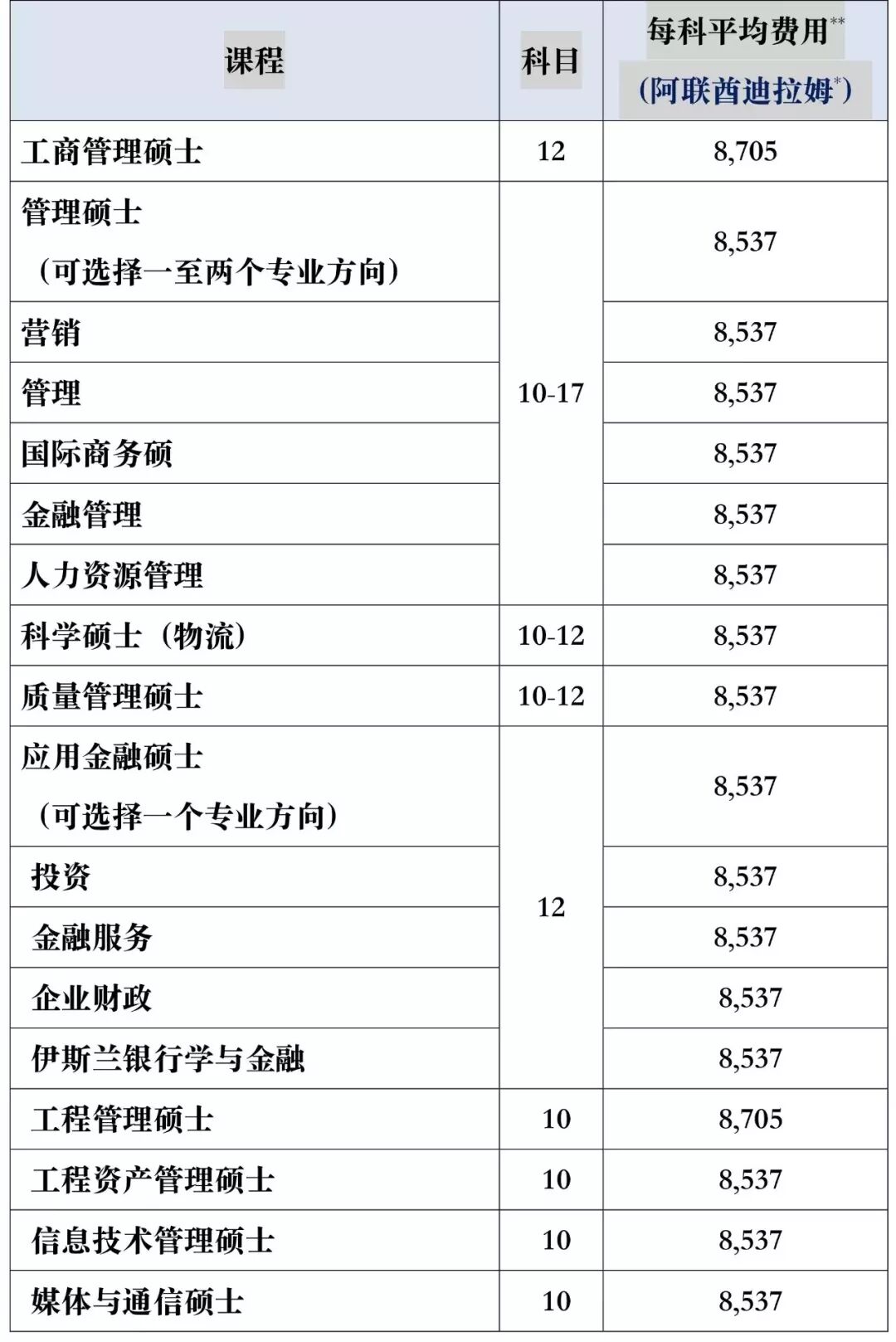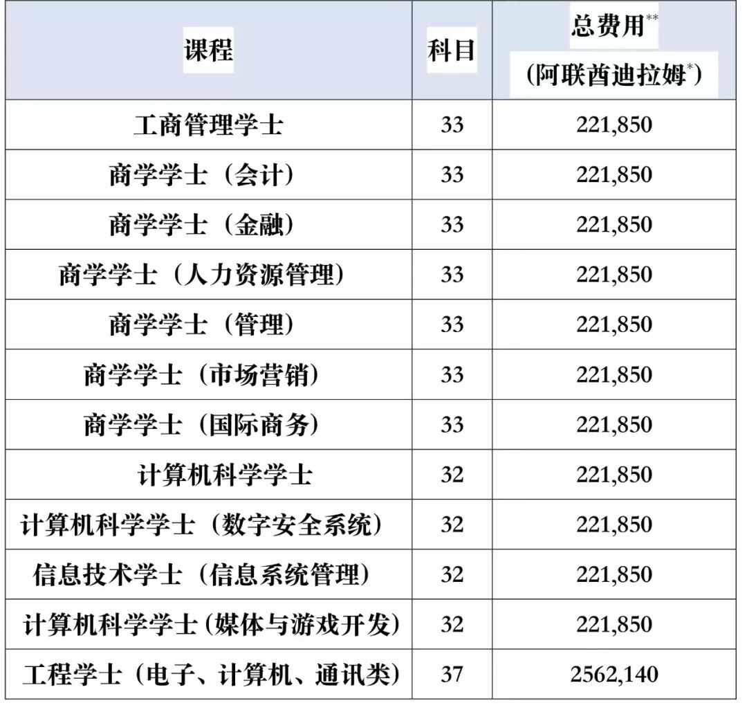 除少数专业需要修10门课程外,大部分专业都需要修读12门科目,专业不同学费不同,各专业总学费一般在8万到10万迪拉姆左右。除持有学生签证的学生外,研究生课程的学费可以按每学期所选科目来提交费用,学生一般每学期选修1到3门课程。全职工作的学生建议每学期最多选修2门课程。除金融与银行学外,学生可以申请和自己本科专业不一样的研究生课程,但可能需要入读基础课程。