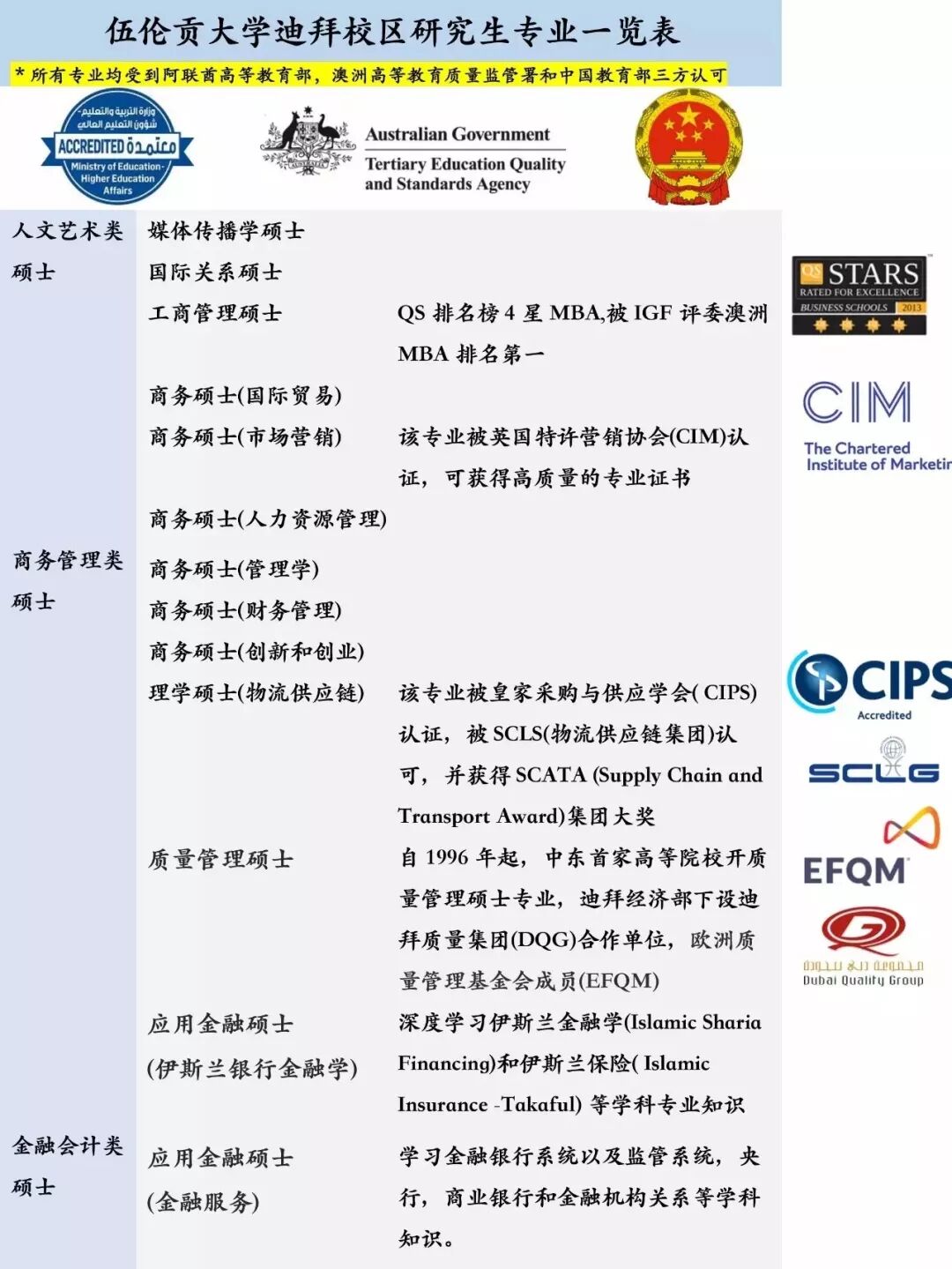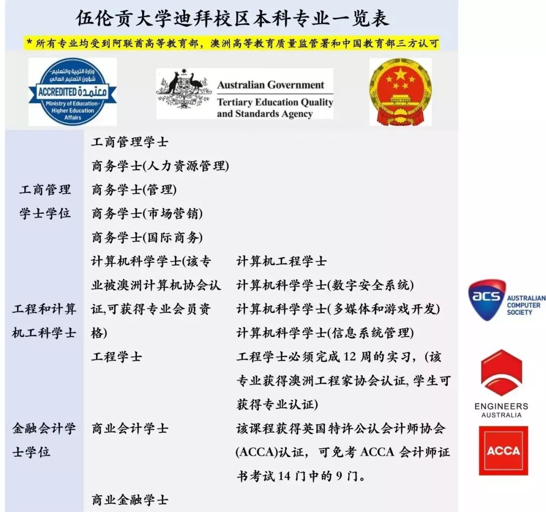 伍伦贡大学迪拜校区所有学位课程均受到阿联酋高等教育和科研部门认证,同时也通过了澳大利亚高等教育质量标准署的审核。学生完成伍伦贡大学校区所有的课程后,可选择获颁澳大利亚伍伦贡大学文凭或者迪拜伍伦贡大学的文凭。该文凭受国际社会的广泛认可,在竞争激烈的人才市场中,UOWD大学的毕业生获得了更多高薪工作的机会。最重要的是,中国学生在此校获得的文凭受到中国教育部认证,这为打算回国发展的毕业证生们提供了更多的机会。
