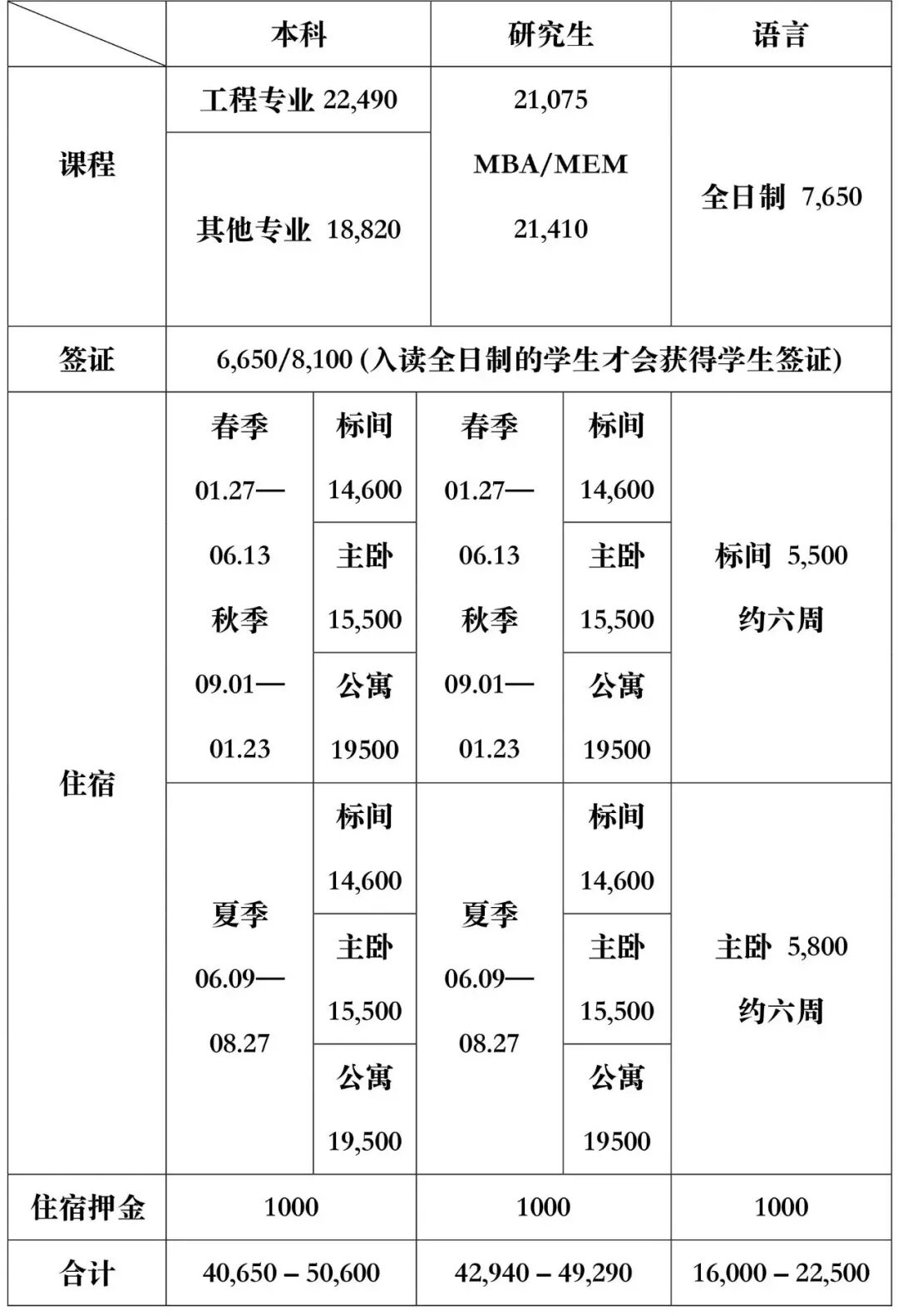 语言班学费明细: