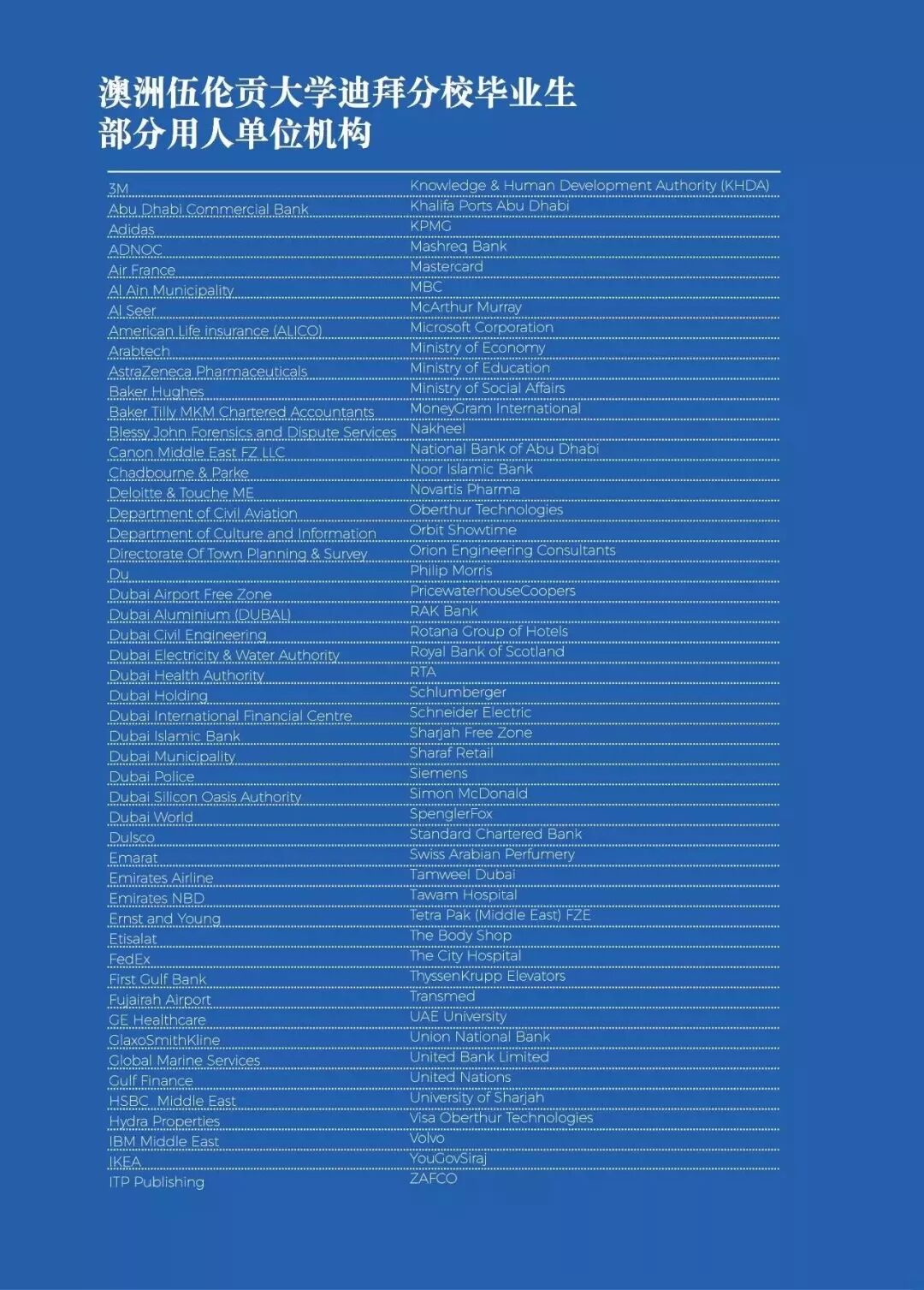 伍伦贡大学迪拜校区是迪拜毕业生就业先锋大学。自1993年建立伍伦贡大学迪拜校区办学以来,上万名毕业生从伍伦贡大学迪拜校区进入迪拜各知名企业,伍伦贡大学俨然已经成为迪拜就业的先锋力量,下面是部分毕业生的就业单位: